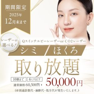 期間 2025.10.1~2025.12.末日 対象者 全ての方 内容 シミ・ほくろ合計10個まで取り放題 通常価格¥60,500→¥50,000 注意事項 1個あたり6ミリ以下に限ります。 6ミリを超えるものや隆起があるものは当院で施術できない可能性があります。 別途、診察料・麻酔代・処方代が発生します。 他割引との併用は出来かねます。 お申込みより3か月以内に施術をお受けくだ...